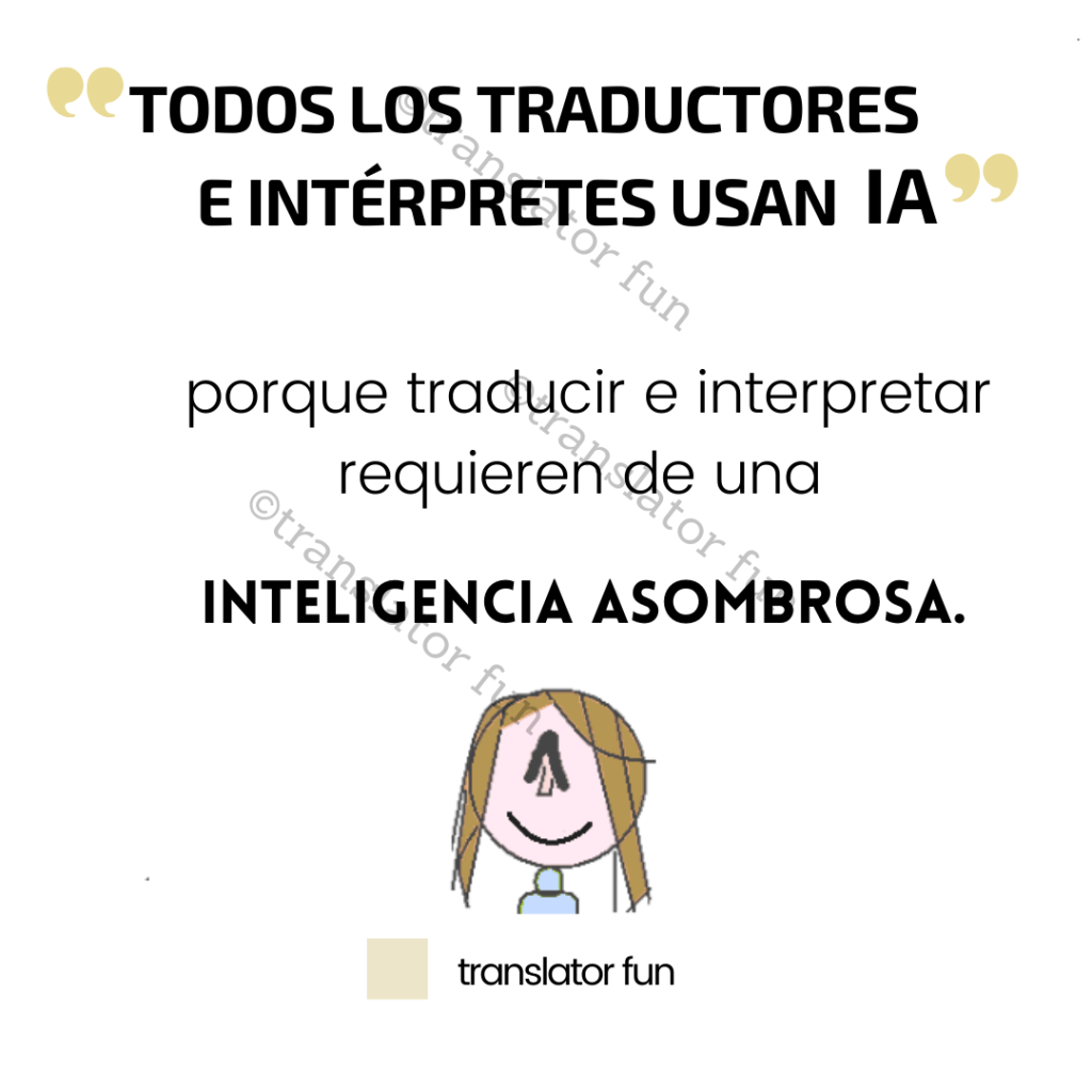 ¡Lo dije! Creo que el 100 % de los traductores e intérpretes utilizan su IA para trabajar. Ser traductor o intérprete requiere una inteligencia que podría calificarse como asombrosa o admirable. La experiencia de habitar dos o más mundos simultáneamente es inigualable. Los traductores e intérpretes pueden ver el mundo en un idioma y luego cambiar a otro distinto para transmitir lo que acaban de ver, leer y oír.